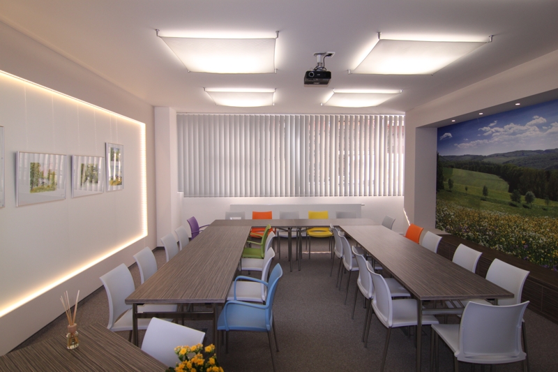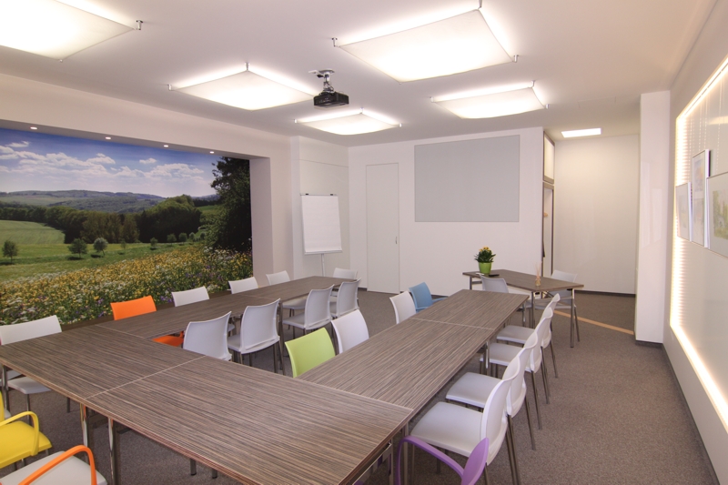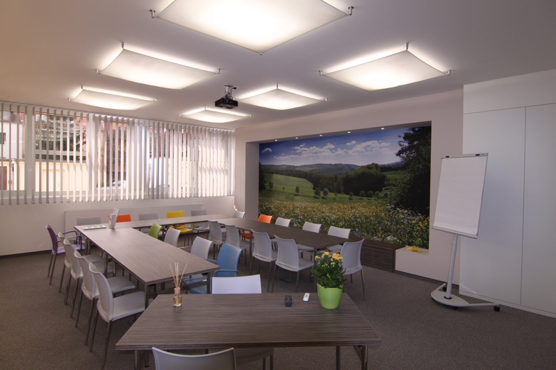 Durch die Schaffung einer positiven und offenen Atmosphäre wird die Aufnahmefähigkeit und kreative Teilnahme der Seminarteilnehmer angeregt. Die Installation einer Galeriewand ermöglicht die Präsentation ortsansässiger Künstler und zeigt damit die lokale Verbundeheit des Unternehmens.